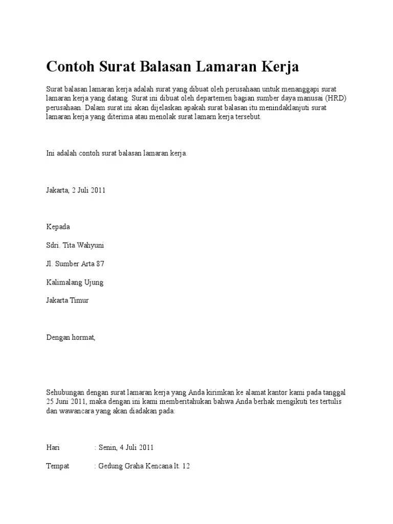 Oleh karena itu, saat anda menulis surat lamaran untuk bekerja maka harus secara teliti agar tidak terjadi kesalahan. Padahal, ada banyak hal yang harus kamu perhatikan. Alamat email anda tidak akan dipublikasikan. Ini adalah contoh surat balasan lamaran kerja. Sehubungan dengan surat lamaran kerja yang telah anda kirimkan ke alamat kantor kami pada tanggal 4 januari 2016, maka dengan ini kami memberitahukan bahwa anda berhak untuk mengikuti tes tertulis dan. Bagian isi surat balasan lamaran pekerjaan yang berisi penolakan secara jelas dan benar. Contoh surat lamaran kerja atau cara membuat surat lamaran kerja yang baik dan benar saya harap segera mendapat informasi dan balasan segera. Dengan demikian, maka untuk anda yang. Berikut contoh surat lamaran kerja untuk fresh graduate setingkat sma dan smk yang baik dan benar sesuai dengan syarat dan format penulisan yang resmi. Panduan cara membuat surat lamaran kerja surat lamaran kerja ini tentu akan sangat dibutuhkan bagi anda yang akan melamar pekerjaan. Para pelamar dan pencari kerja tentu akan memberikan banyak lamaran kerja kepada perusahaan yang berbeda beda. .balasan lamaran kerja yang berisi penolakan berikut ini yang tidak tepat adalah a.berdasarkan surat lamaran anda yang telah kami terima ,kami harap saudara datang untuk wawancara b.berdasarkan surat lamaran anda tetangga.dengan ini,kami beritahu bahwa tidak ada lowongan c.lamaran. Baik untuk anda yang baru saja lulus kuliah.